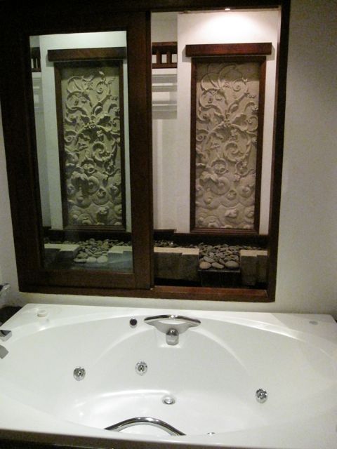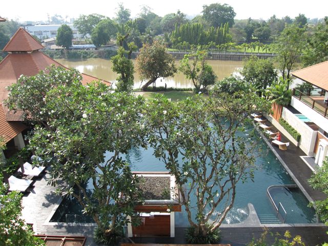 We arrived at Chiang Mai this evening, checked into the Hotel and then went straight to the Night Market, which was smaller than I imagined (still pretty big). After strolling around and looking at mostly rubbish on sale (fake watches, stupid T-Shirts, etc.) we went to one of the Food Plazas and sampled some of the local specialties, which actually proved that the restaurant we discovered in Bangkok was serving authentic Northern food. I went for three North Thailand classics, Papaya Salad, Chiang Mai sausage and sweet sticky rice with mango (that’s 130 Baht, or about £2.50). The first two were very tasty, the latter very, very sweet (but disturbingly delicious!)We’re now back at the Ratilanna Hotel, which is a five minute Tuk Tuk ride from the Night Market in a quieter area on the river. I booked a river view suite which is really nice – a gorgeous dark wooden floor, a large sitting room and bed room and a ridiculous bath room (see picture below). The public areas of the hotel are also very nice, with a large pool, a Spa and very attentive and friendly staff. Very good first impression!! Haven’t made any plans for tomorrow yet, we will probably do that over breakfast. I don’t want to go to visit one of the mountain villages since I don’t like the idea to invade what is supposed to be a traditional village maintaining its original culture (which with the constant invasions from tourists it probably isn’t anymore anyway – I imagine it to be more of a rather sad simulation of what these people’s lives once looked like, at least that’s what we had experienced when we visited the Tunisian desert people many years ago). Maybe we go to Elephant Nature Park, the elephant „retirement home“ I believe I mentioned in an earlier blog. Maybe we just do some city sight seeing tomorrow and take it easy (Spa, Pool) before the rain catches up with us, or whatever Mother Nature has in store for us next!!