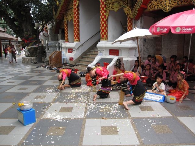 April 2nd, 2011Today we went to Wat Phra That Doi Suthep, one of the most sacred temples in Northern Thailand located 13km outside of Chiang Mai at about 1000m height in the nearby mountains. Through the hotel we booked a driver and included Phra Tamnak Phu Phing, the Royal Palace Gardens, which are nearby and a visit at a local Hmong Village (it was only 100 Baht more) when we made the booking. As expected, the visit to the Hmong people was disappointing – it’s just a big collection of souvenir stands selling predominantly clothes and other fabrics, silver jewelry, statues of elephants and buddhas of various sizes, etc. Unless you are interested in buying some of this stuff, skip this part – even the waterfall, which warrants a 10 Baht entrance fee, is rather disappointing. The Suthep temple and the Royal Gardens though were beautiful, the former extremely busy and crowded with (mostly Asian) tourists, the latter, also due to its size, providing a very relaxed atmosphere.